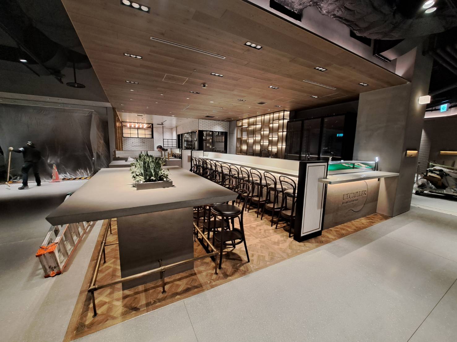 高輪ゲートウェイに新たに出店するオイスターバーの新装工事を、弊社が担当いたしました。モルタル仕上げの重厚なカウンター、天井一面に張り巡らされた無垢の木板、そして真鍮のフレームが繊細に光を抱く飾り棚——異なる素材が織りなすコントラストが、パリの路地裏を思わせる洗練された大人の空間を形づくっています。