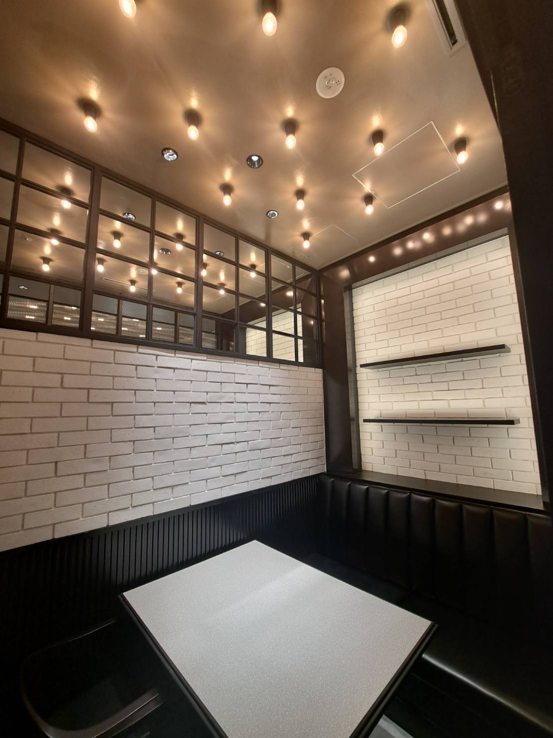 足元には細やかなヘリンボーンの寄木を敷き詰め、上質さが静かに立ち上がる仕上がりに。白いサブウェイタイルの壁面が清潔感と軽やかさを添え、カウンター越しに広がるオープンキッチンのライブ感と、ゆったり寛げるボックス席の落ち着きが、ひとつの店内で美しく共存しています。格子状にガラスを嵌め込んだ間仕切りは、視線をやわらかく区切りながら、空間に奥行きと物語を与えています。